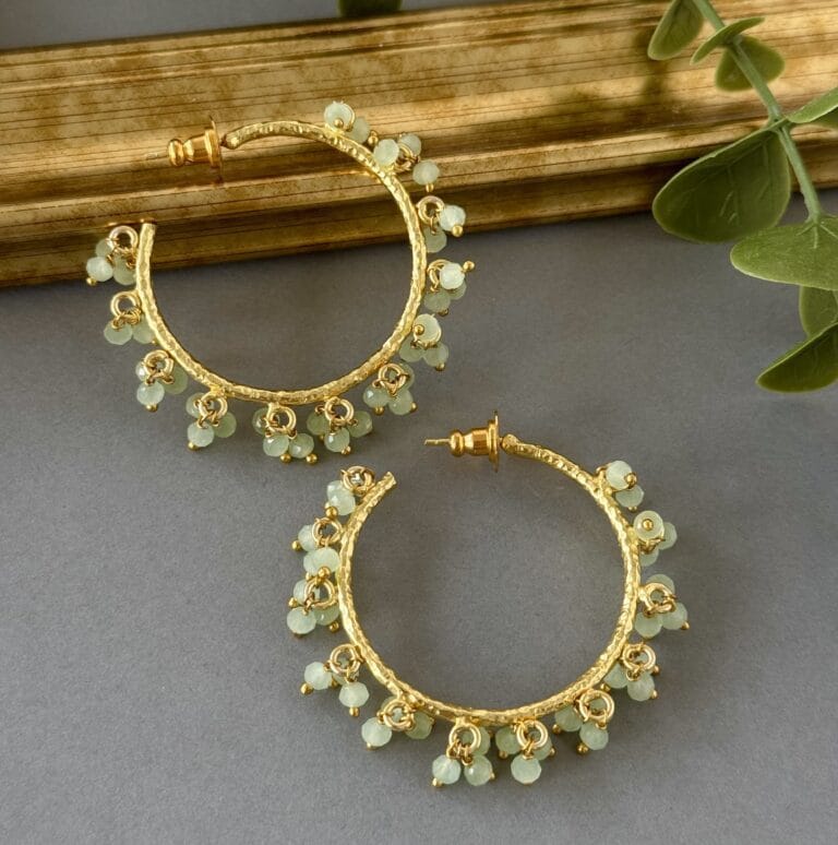 Add elegance to any look with these stunning gold-plated hammered effect bali with mint crystals