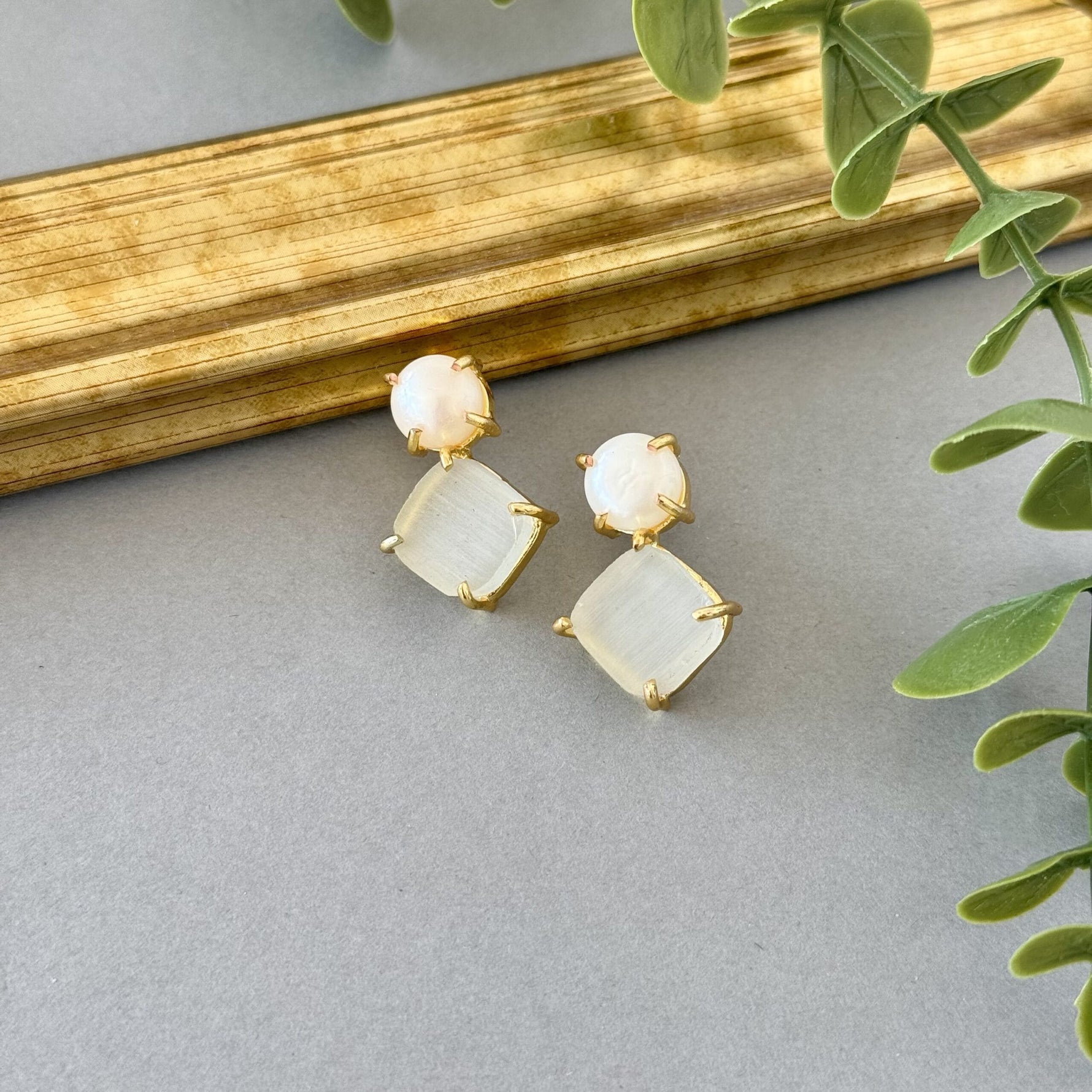 Unit price perElegant gold-plated earrings featuring baroque pearl and brushed white-hued square drops for a timeless, sophisticated look.