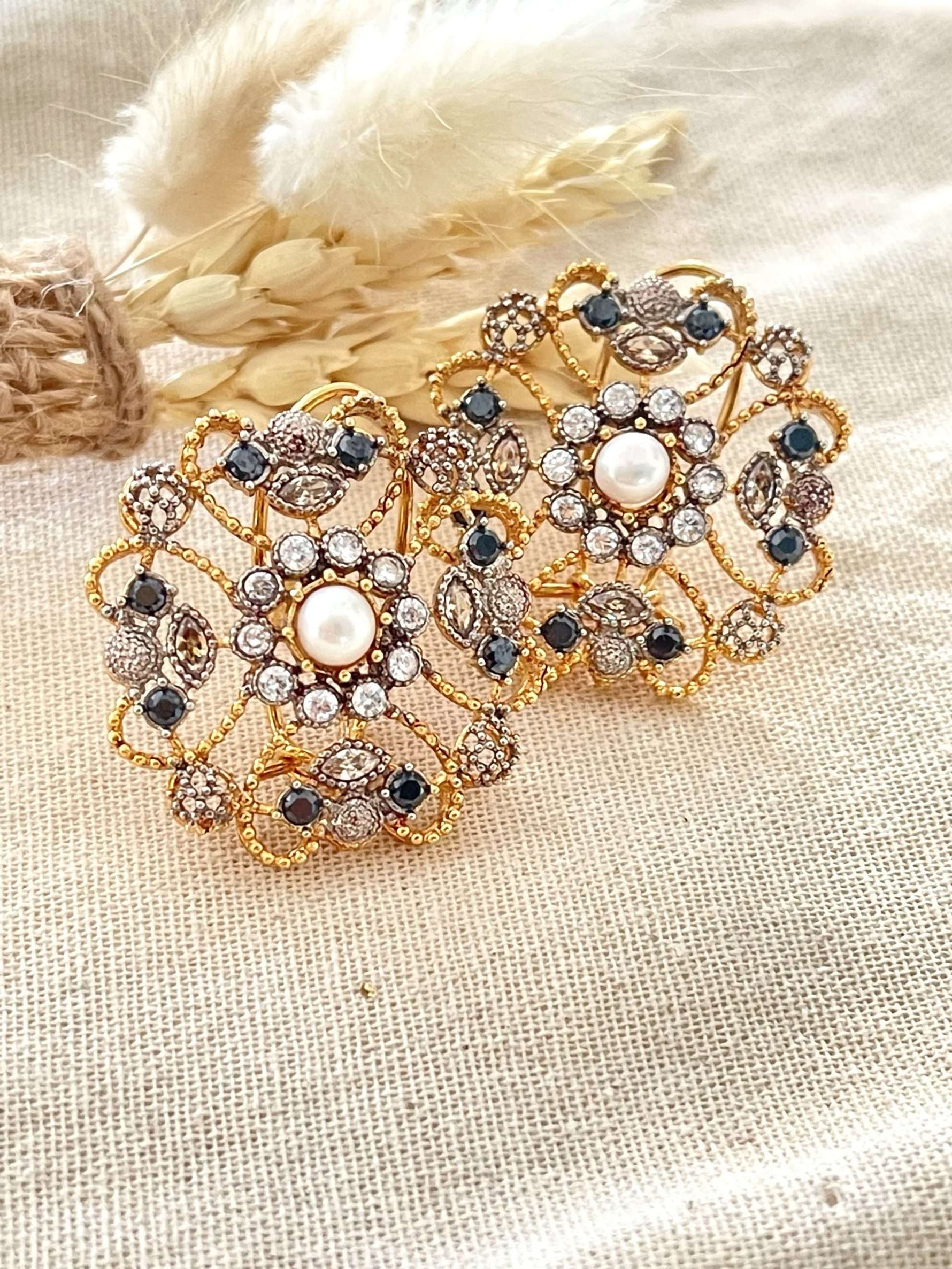 Handmade wired gold plated tops with beautiful pearl and black onyx stones.