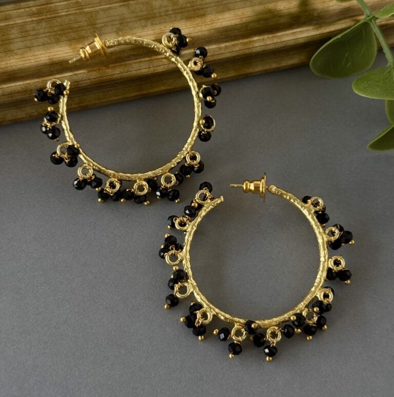 Add elegance to any look with these stunning gold-plated hammered effect bali with black crystals