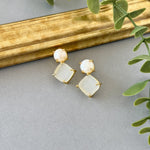 Elegant gold-plated earrings featuring baroque pearl and brushed white-hued square drops for a timeless, sophisticated look.